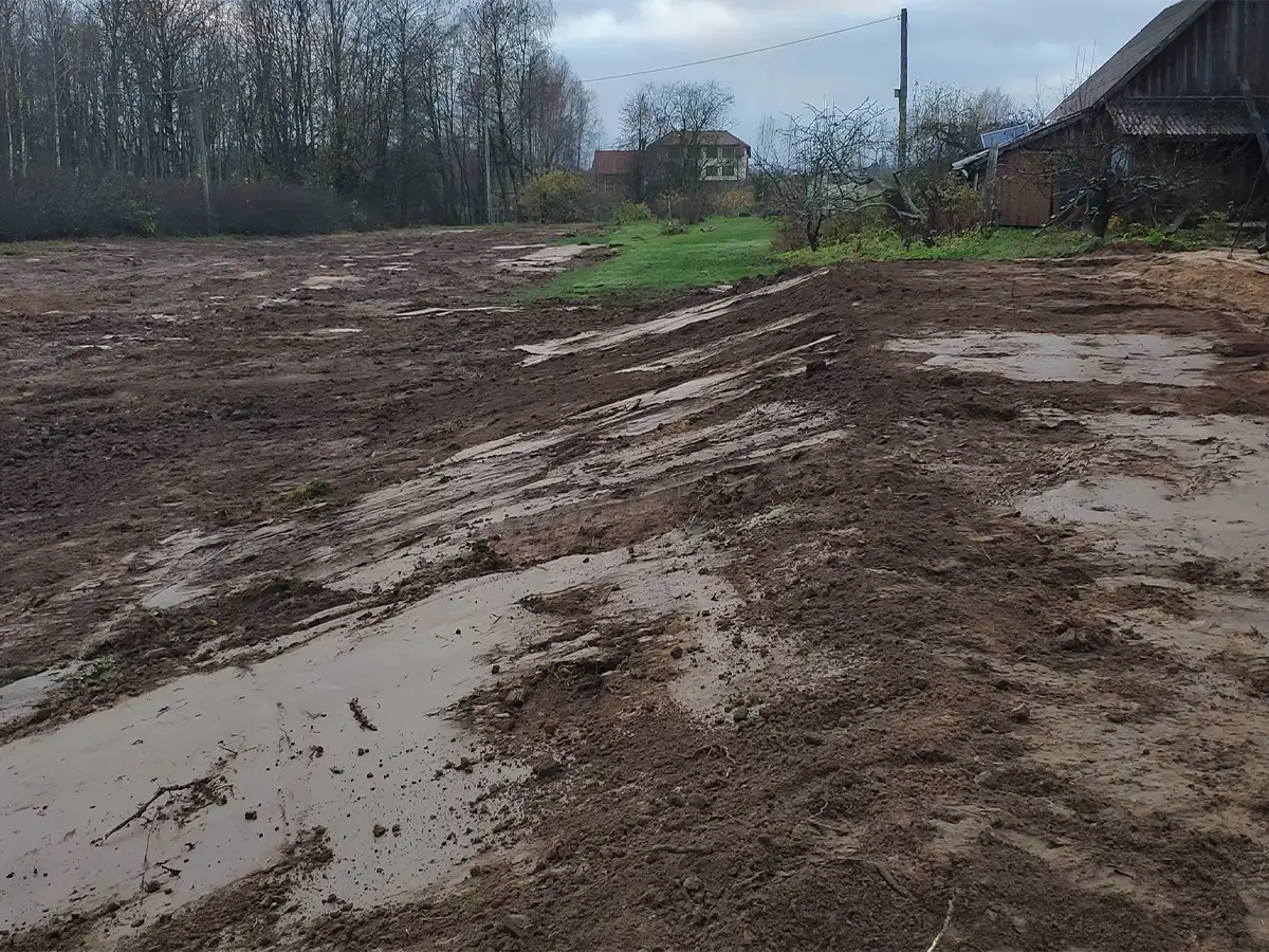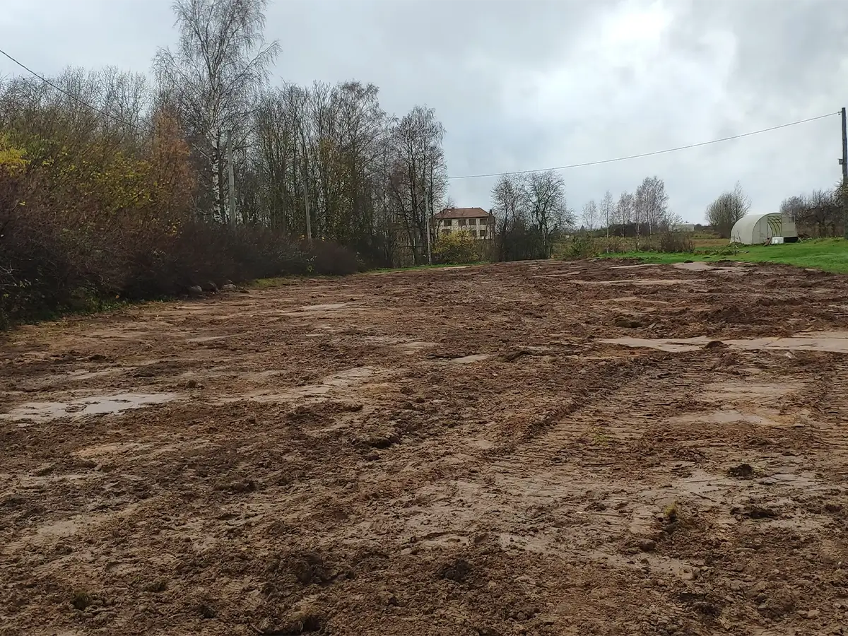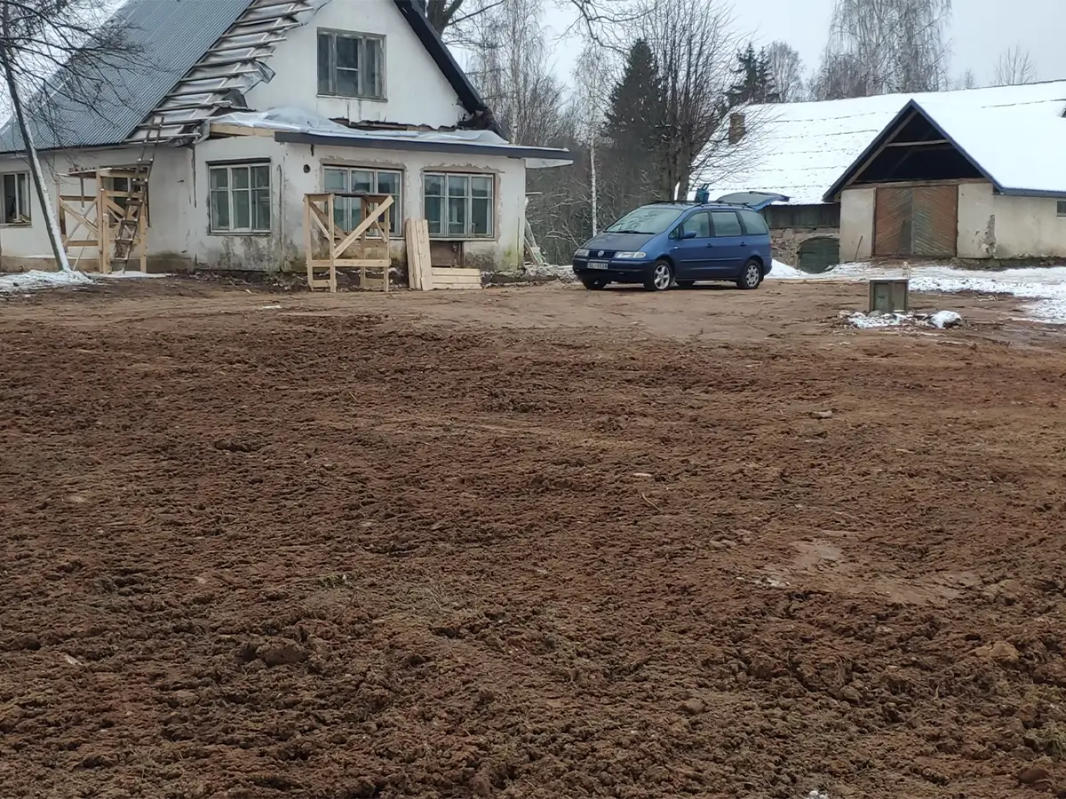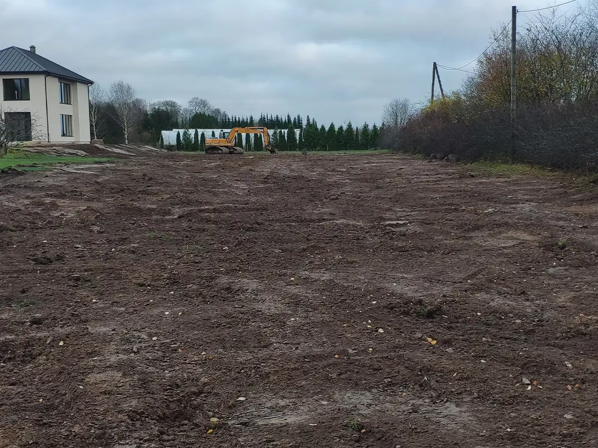 Reljefa izlīdzināšana teritorijas sagatavošanai – zālienam, bruģim, piebraucamajiem ceļiem.